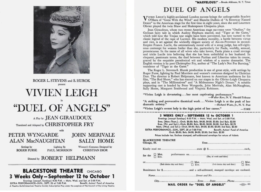 ‘Duel of Angels’ by Jean Giraudoux, was another theatrical skirmish between the sexes that seemed so popular throughout the late Fifties and Sixties. On this occasion, however, it lined up firmly on the side of woman, and pours destructive barrages of scorn of the disparaging moral standards of men.