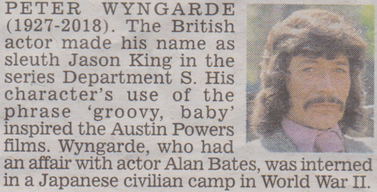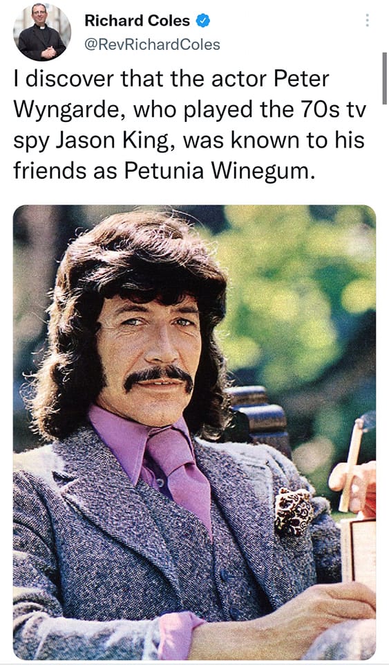 ‘Everyone who watched TV in the 1970s will have felt strangely nostalgic hearing of the death of Peter Wyngarde who played the inimitable sleuth Jason King. Nostalgic for a time when men could get away with wearing trousers whose crotches were even tighter than the massive knots around their neck. When males looked on in envy at a stunning moustache and sideburn combination they could never hope to grow, and females lusted over a handsome devil they could never hope to attract due to his being known in the business as Petunia Winegum[1]. And nostalgic for a time when hard-living actors uttered lines like Wyngarde did, which came from a real place: “A bit too early for coffee… I think I’ll have Scotch.” RIP, you suave sod.”