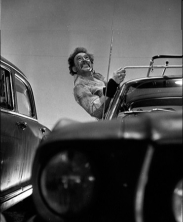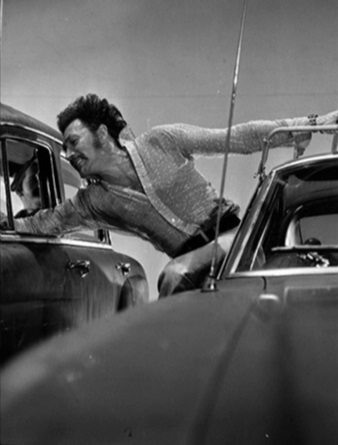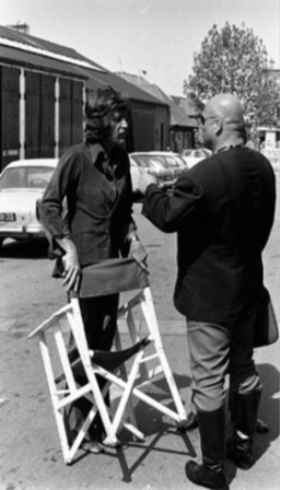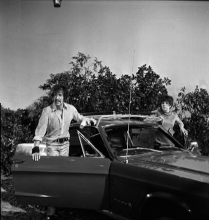 Above Left: A rare on location shot of all 4 Department S regulars. Behind car (L-R): Joel Fabiani and Peter. In front of car (L-R): Dennis Alaba Peters and Rosemary Nicols. Above Right: Again on location – a scene from, ‘The Pied Piper of Hambledown’. Joel, Rosemary and Peter with director, Roy Ward Baker.