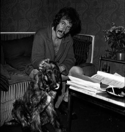 Above: Peter and his beloved dog, Yussef, in his dressing room at Elstree Studios during a break in filming.