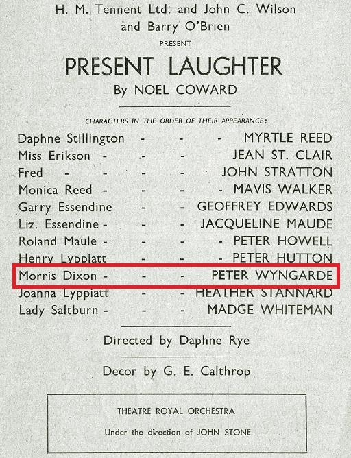 In 1946, Peter Wyngarde took his first professional roles in theatre productions. An early success was in the part of Morris Albert in a production of Noël Coward’s Present Laughter which opened on 7 August 1947 at the Theatre Royal, Birmingham.