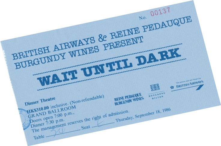 This production went under the banner of ‘Dinner Theatre’, whereby a five-course cordon bleu meal was served to the audience who were seated at table, followed by a performance of the play. An extensive list of fine wines were on offer at an extra cost. Tickets for the meal and play cost around £200.